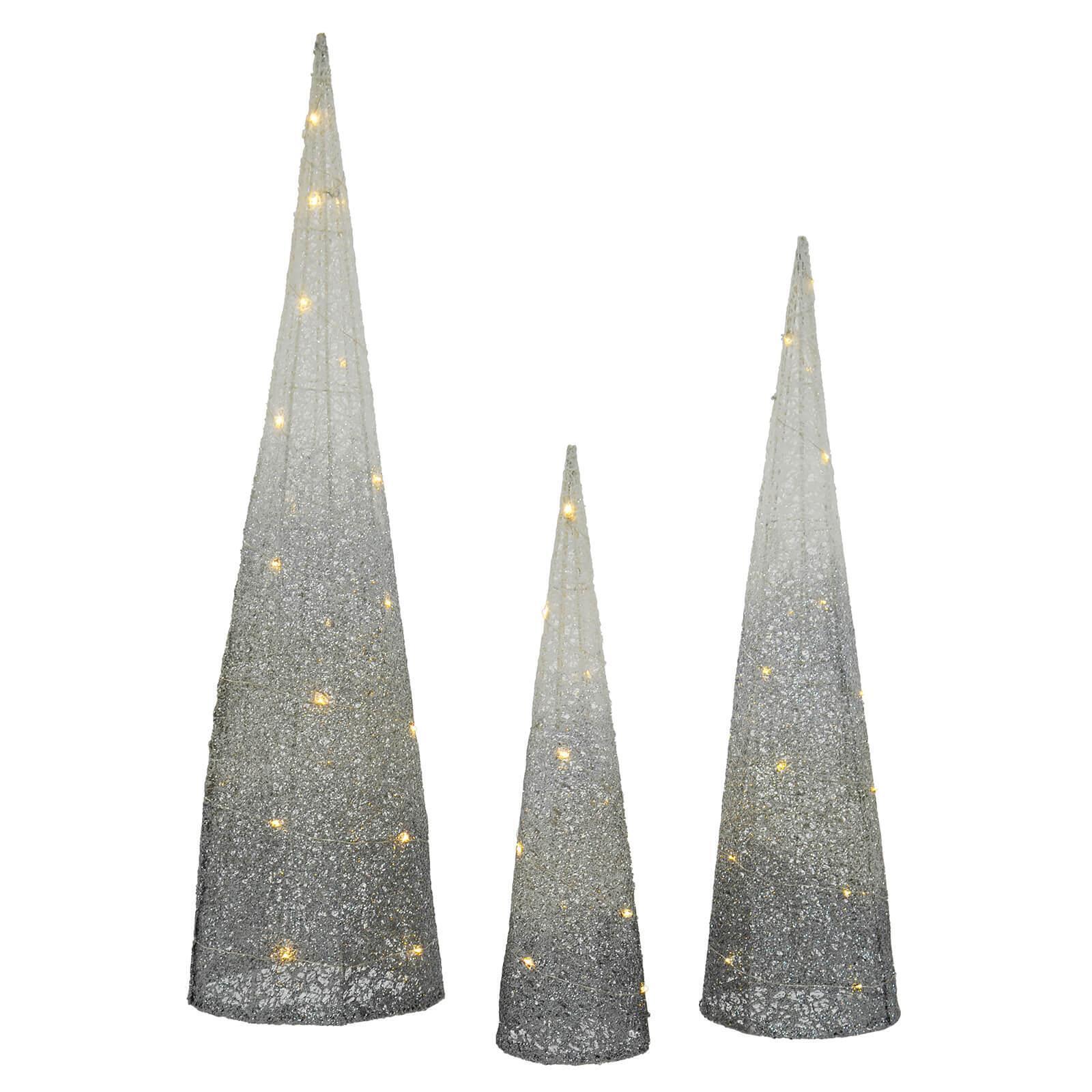 Pre-lit Christmas Cone Trees Set of 3 LED White Silver Ombre Glitter Mesh 100cm