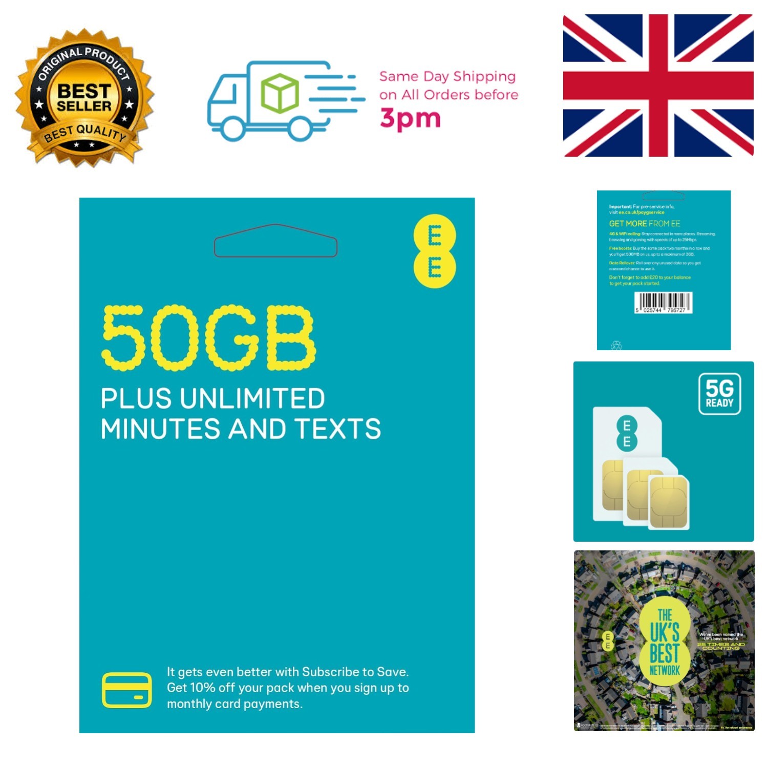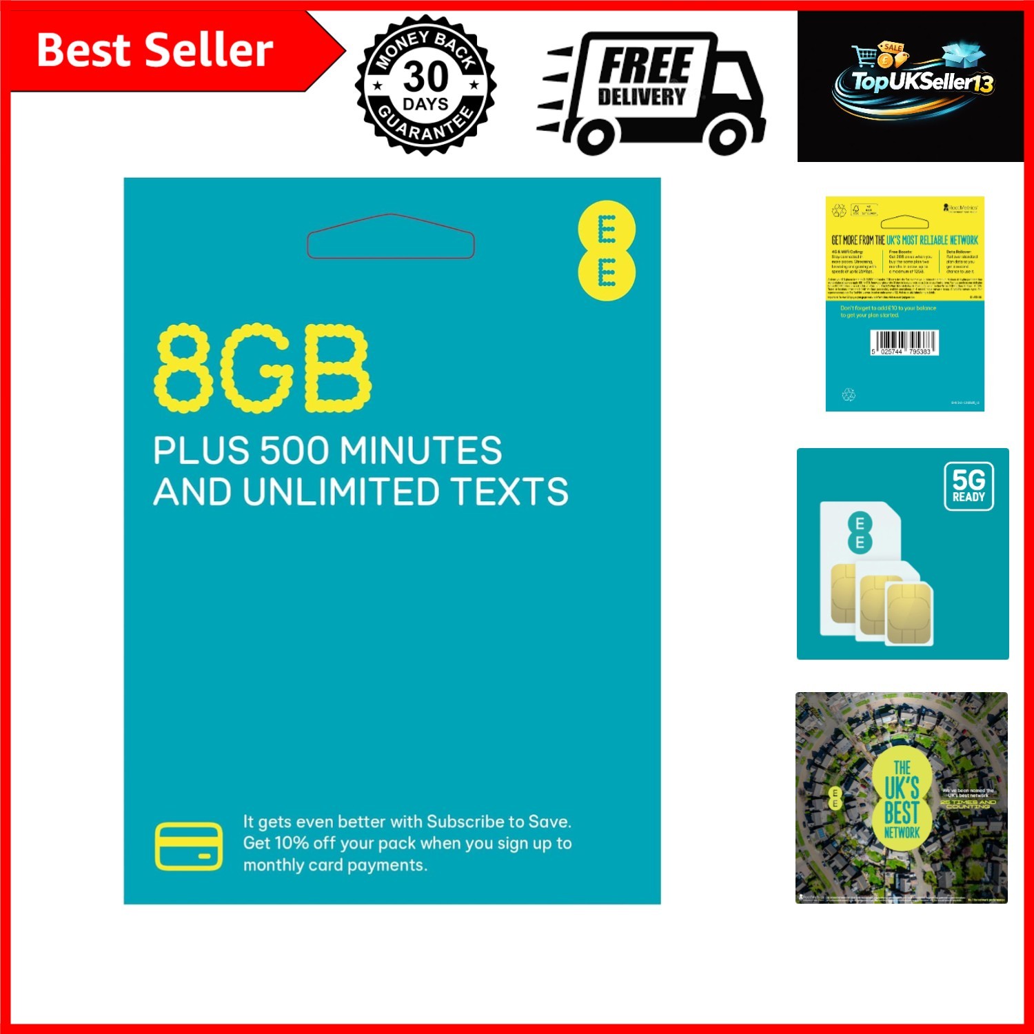 EE Pay As You Go SIM Card UK PREPAID PAYG £10 Bundle 8GB Unlimited Texts 500 Min
