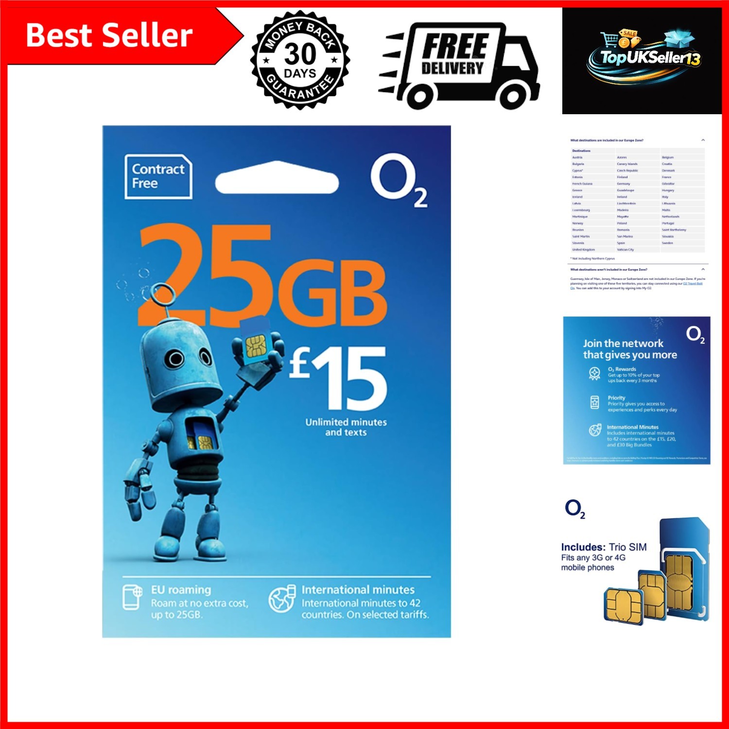O2 SIM Card UK & EUROPE PREPAID PAYG 30 Bundle 12