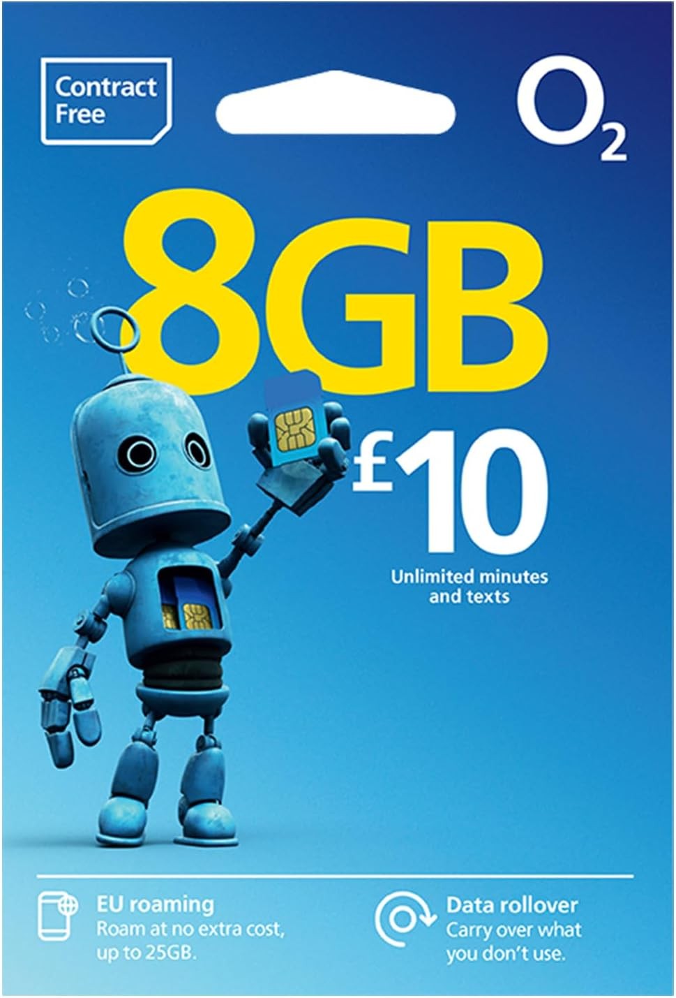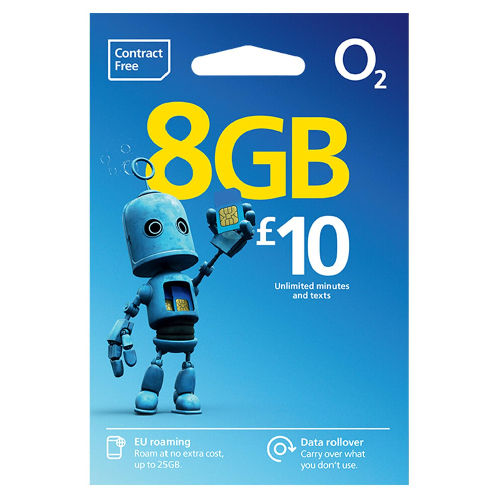 O2 SIM Card UK & Europe Prepaid PAYG £10 Bundle 8GB Data, Unlimited Minutes & Te