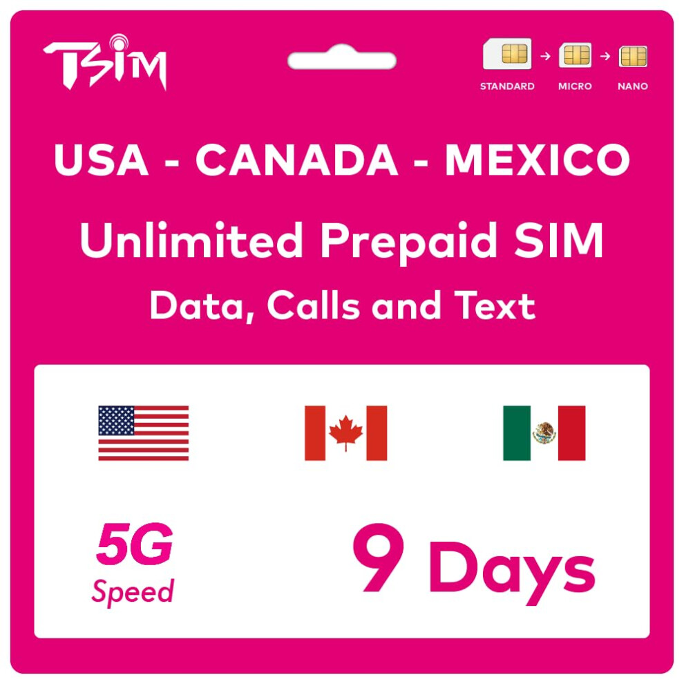 TSIM Prepaid USA SIM Card for 9 Days | Unlimited 4G/5G High-Speed Data in the USA + Unlimited Low Speed Data in Canada & Mexico | Unlimited Local Cal