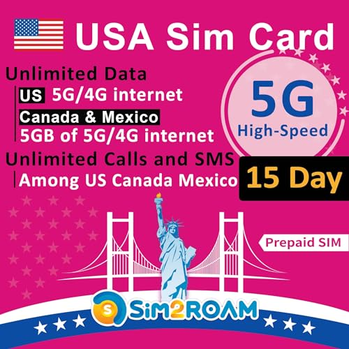 SIM2ROAM USA Prepaid SIM Card Unlimited 5G/4G LTE High-speed Internet Data in US (Hawaii included) Unlimited Calls and Texts (SMS) in United States Refillable! (15 Days)