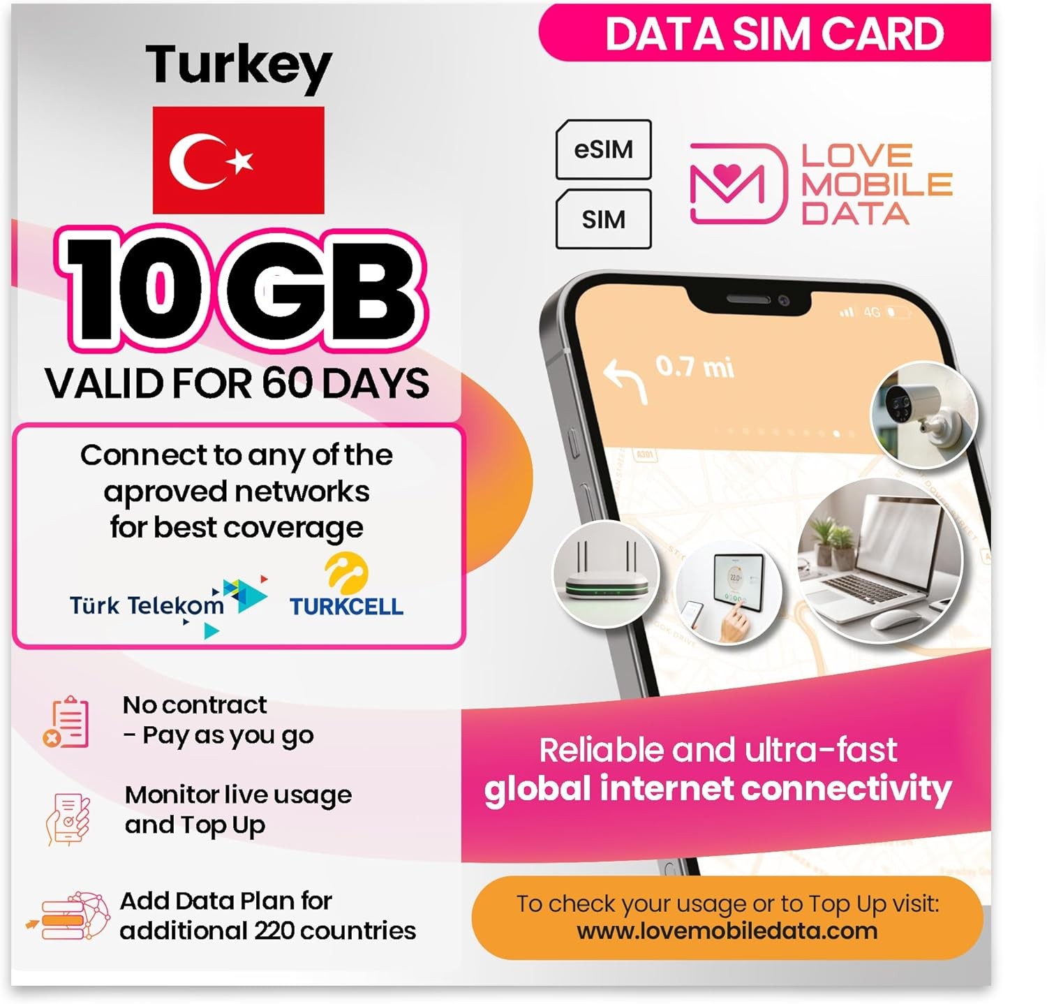 Love Mobile Data Only SIM Card 10GB for 60 Days UK & Turkey 4G/5G Prepaid