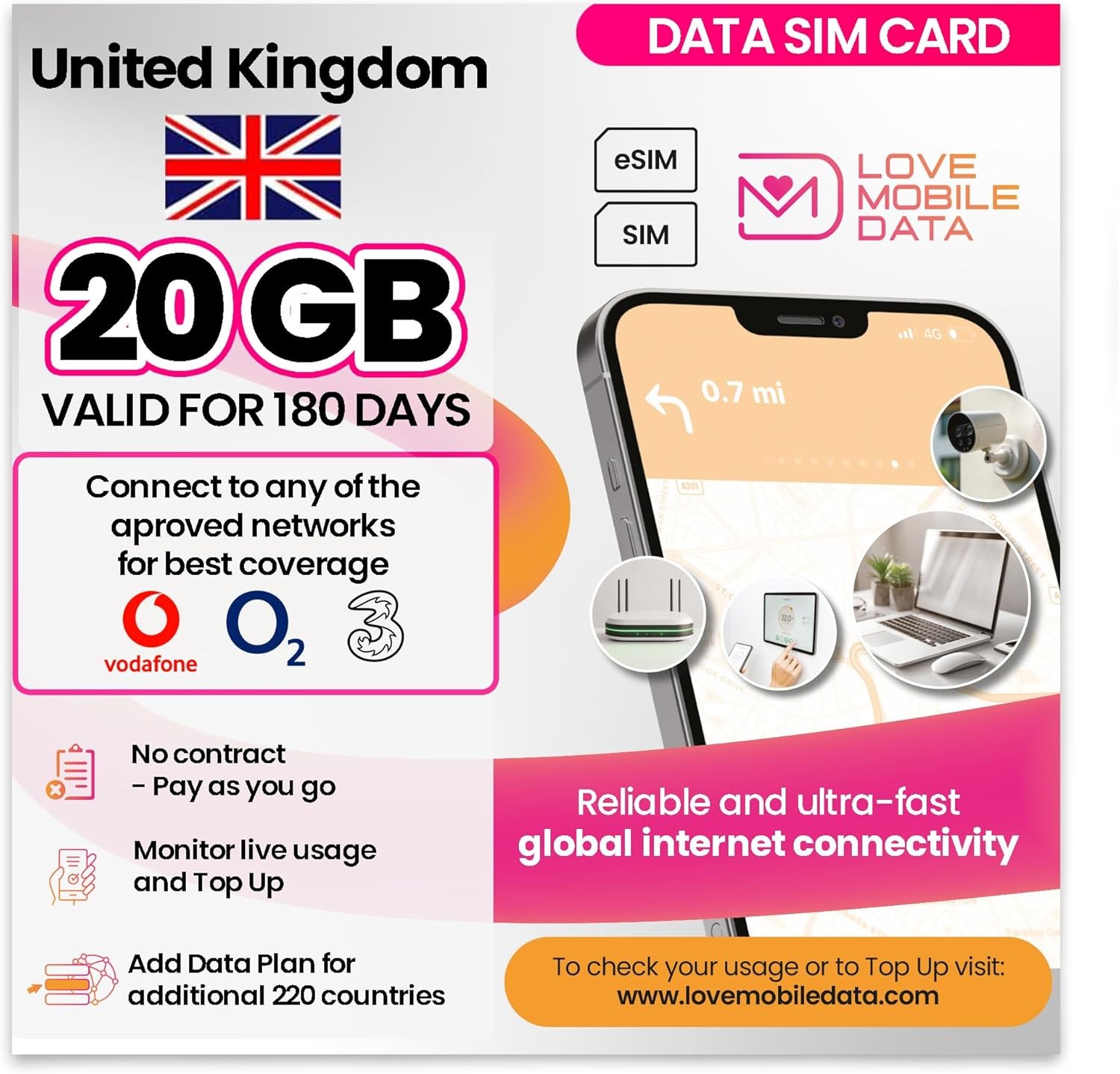 Love Mobile Data Only Sim Card - International Multi-Network 4G/5G Prepaid Pay As You Go Data Sim for Mobile Phones, WiFi Routers, United Kingdom (O2