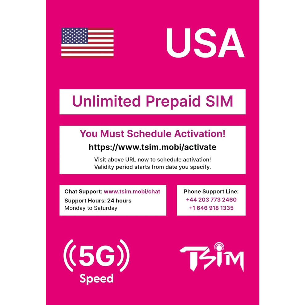 USA SIM Card for Travel to the USA. PrePaid. T-Mobile network with Unlimited Data, Calls and Texts. New Upgraded 5G SIM Card! (5 Day)