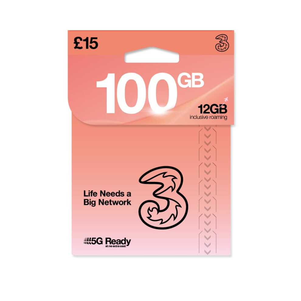 THREE 4G/5G SIM Card UK & ROAM FREE in over 70 destinations - PREPAID PAYG 15 Bundle - 75GB + (25GB FREE DATA) Unltd Texts & Mins - ROAMING ALLOWANC