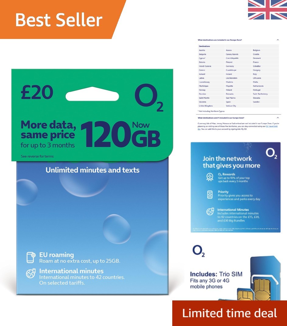 O2 Multi-Use SIM Card with 40GB Plan + 80GB Monthly Bonus - Perfect for Travel!