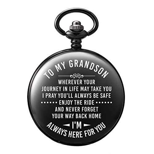 TREEWETO Mens Engraved Pocket Watch Gifts from Grandpa Grandma, Unique Birthday Gift Ideas for Grandson, Graduation Gifts for Him, Present for Boys Men, Black
