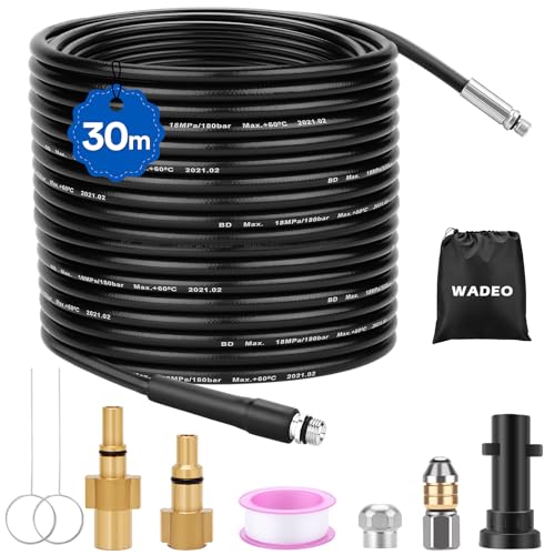 WADEO 30M/100FT High Pressure Drain Hose, [Heavy-Duty] [Full Set of Adapters] Flexible Drain Rod Kit for Pressure Washer Karcher K2-K7 Series & LAVOR
