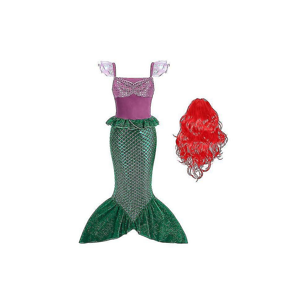 (With wig, 6-7T) Girls Mermaid Princess Dress Ariel Cosplay Costume Kids Halloween Carnival Party Costume