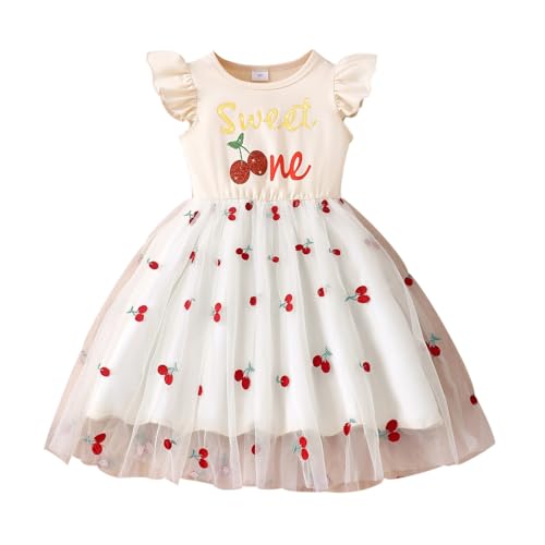 Princess Dresses For Girls 5-6,Girls Dresses Casual Sleeveless Mesh Dress With Cartoon Strawberry Cherry Print Elastic Waist Comfortable Playwear For Toddler Kids Age 2 7 (White, 6-7 Years)