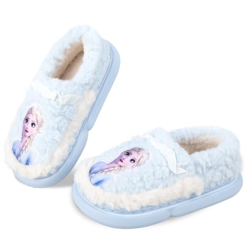 Girls Slippers Home Slippers Toddler Winter, Cute Cartoon Slip on House Shoes Blue Princess Fluffy Kids Warm Plush Comfy Non-Slip Gifts for Children Size Kids 3-9 Years