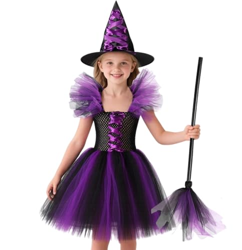 HarnyLoom Witch Costume Kids Girl Witches Dress Princess Outfit Scary Purple Hat Brooms Party Cosplay Carnival Fancy Dress (Purple, 130 (7-9 years))