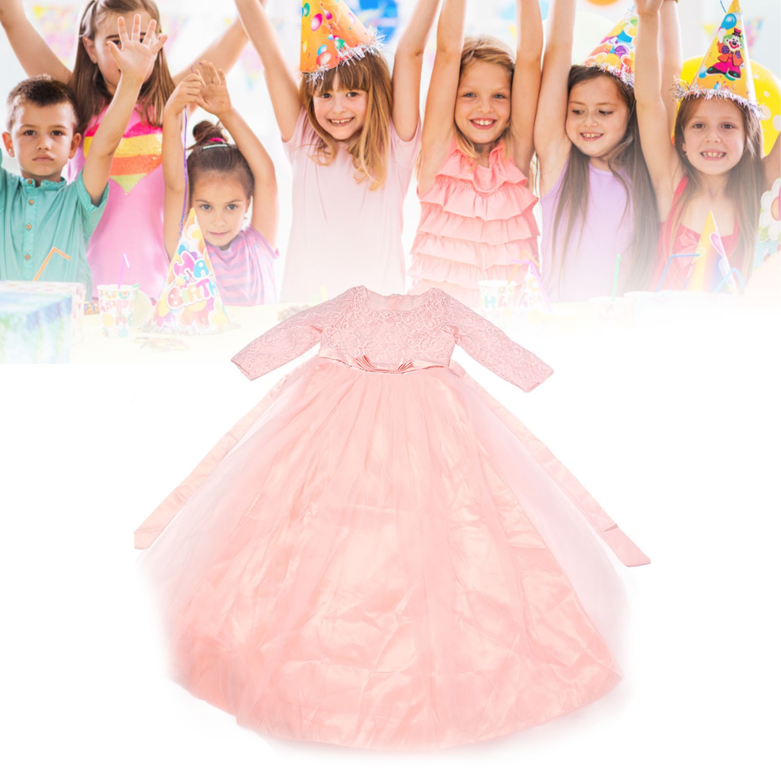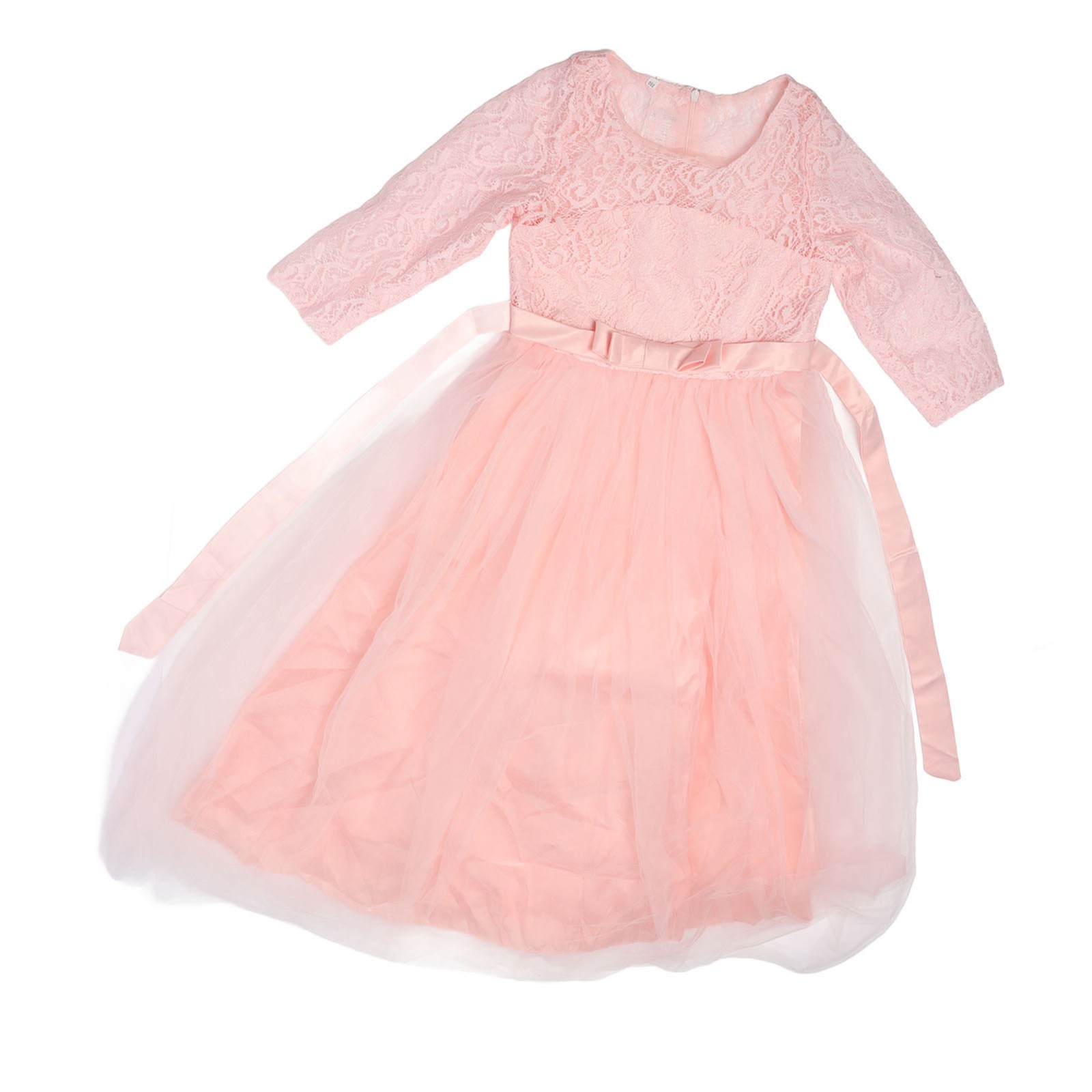 Pink Girl Performance Dress Lace Long Sleeves Princess Pageant Bow Tie Pure OU