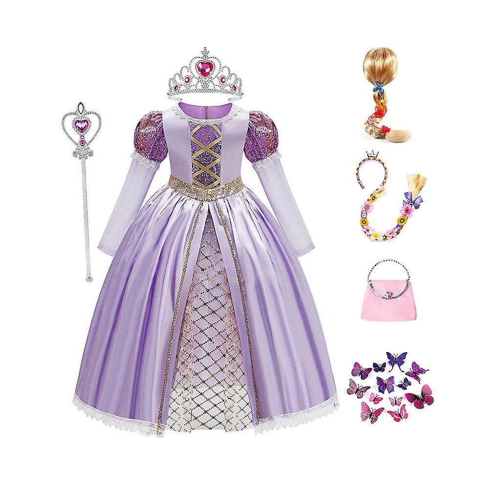 (Only Butterfly Broochs, 140cm) Tangled Rapunzel Princess Dress Skirt Halloween Party Cosplay Costume Girls Dress Wig Handbag