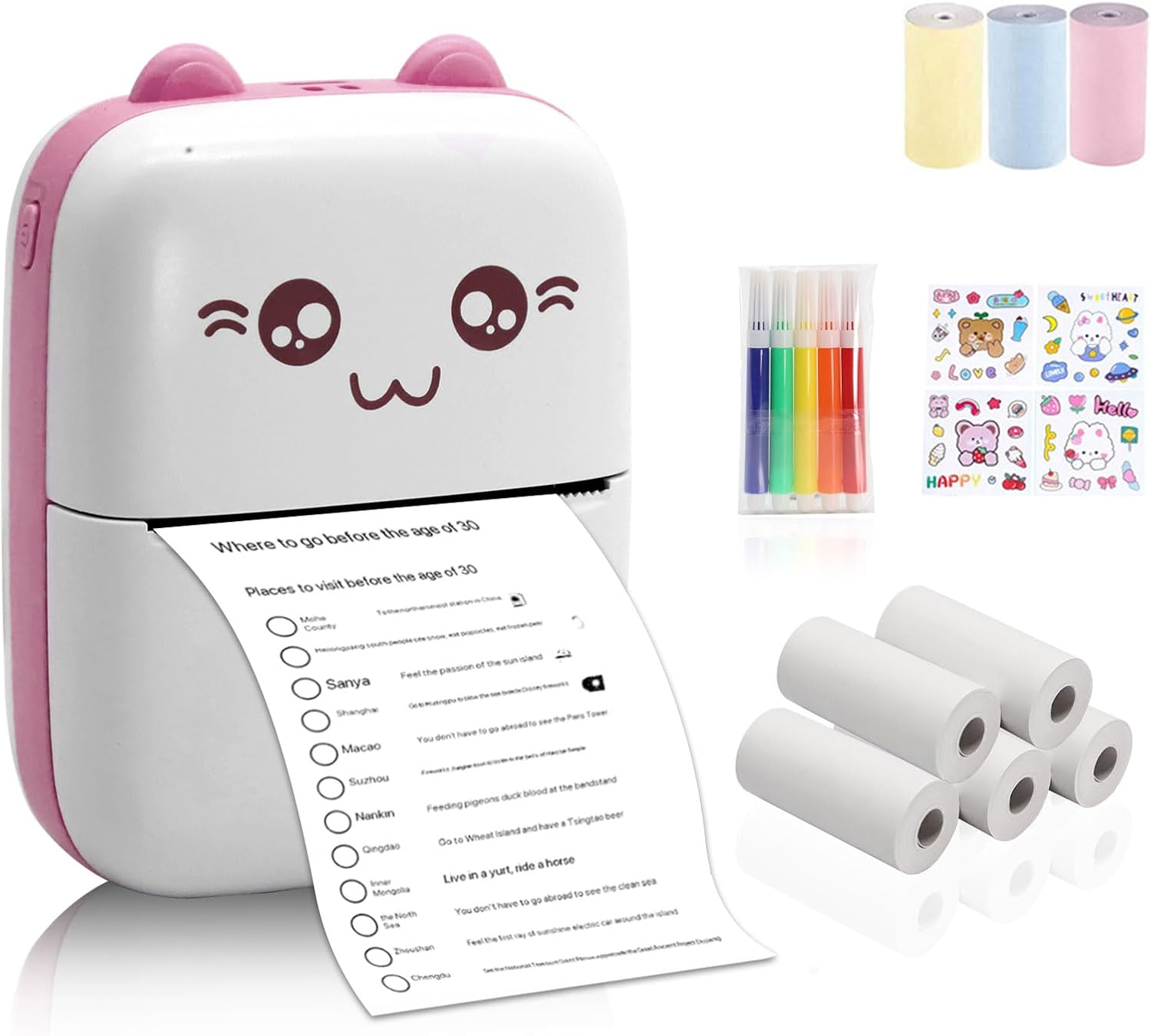 Wowfast Mini Portable Printer for iPhone, Bluetooth Sticker Printer with 3 Colorful Rolls, 5 White Rolls, and 5 Colored Pens for DIY Creation, Study Notes, Pictures, Receipts, Lists (Pink)
