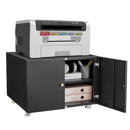 GarveeMore Printer Stand with Storage Cabinet & Wheels, Heavy Duty Metal Mobile Printer Table with Adjustable Shelf & 2 Doors, 23.6" H Rolling File Cabinet for Home Office, Black