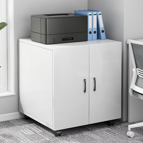 GarveeMore Printer Stand with Storage Cabinet & Wheels, Heavy Duty Metal Mobile Printer Table with Adjustable Shelf & 2 Doors, 23.6" H Rolling File Cabinet for Home Office, White