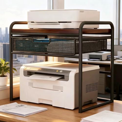 OAKVYNE Printer Scanner Fax Storage 2 Tier Printer Stand Wood Desktop Printer Table Steel Frame Printer Shelf For Scanner Files Printer Riser Office Desk Copier Storage Rack(A-Black,27cm)