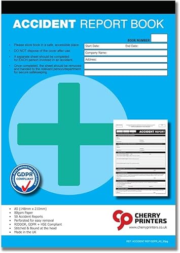 Cherry Printers GDPR Compliant Accident Report Book A5 | 50 Accident Forms | RIDDOR + HSE Compliant | Perforated for Easy Removal | 80gsm Paper | Stitched at Head | Made in UK |