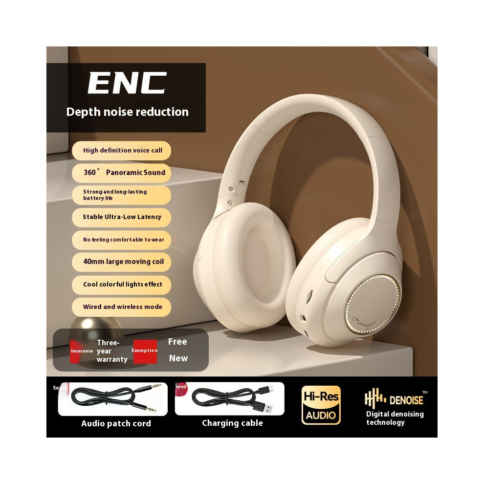 (Off white) 2025 new private model full-inclusive ear luminous Bluetooth headset rotating large ear cups for extra long battery life
