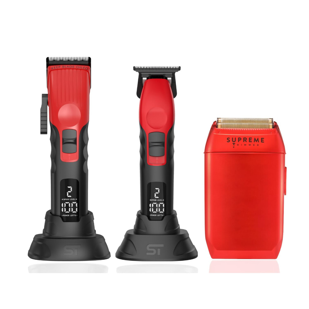 Supreme Trimmer 3-in-1 Barber Bundle | 2Spee Clipper, 2Spee Trimmer & Crunch Foil Shaver | Professional Beard Trimmer Mens Hair Clipper Kit | Red