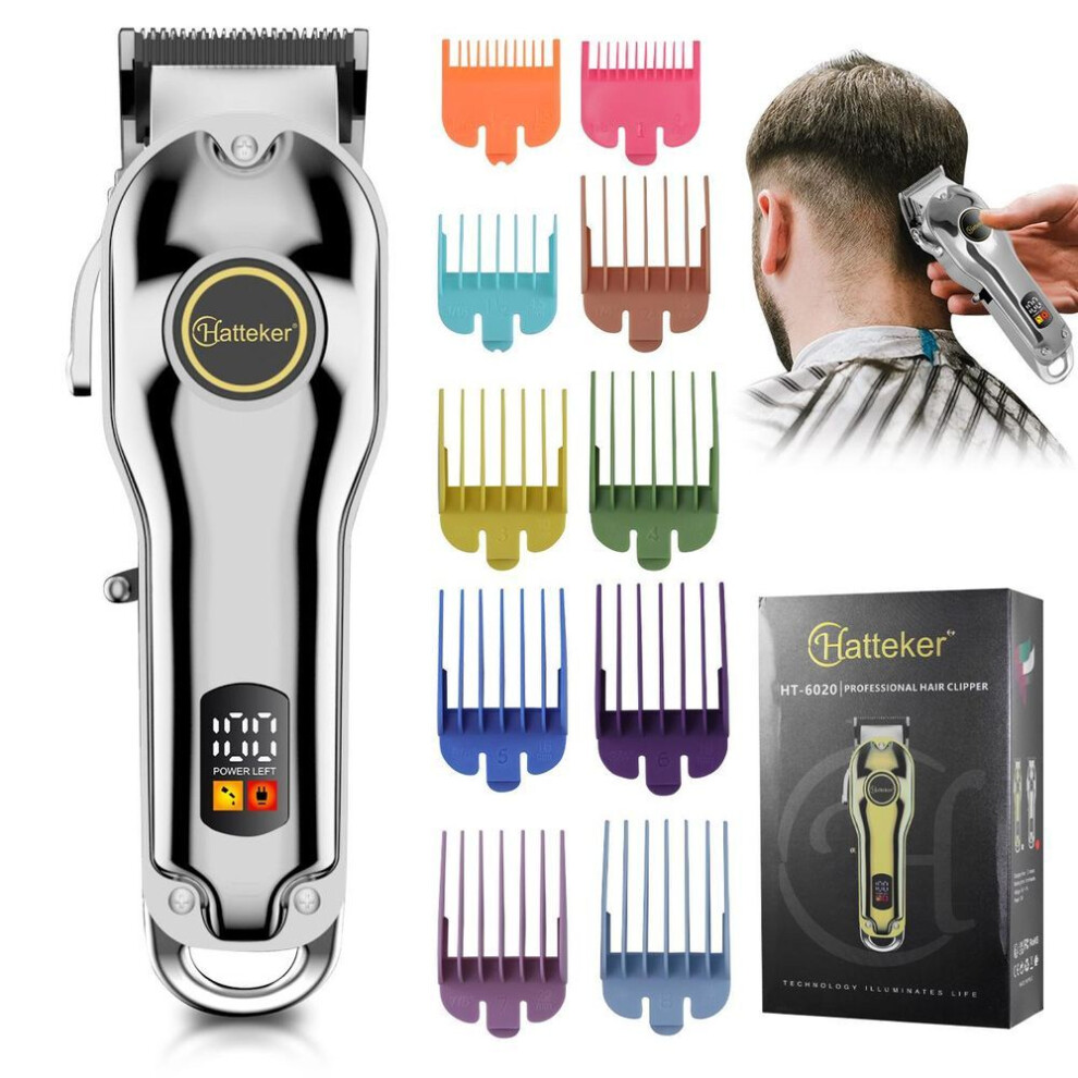 (silver, HT-6020Y) HATTEKER Hair Clippers For Man Professional Electric Beard Trimmer Cordless Men's Grooming Kit Rechargeable 696F