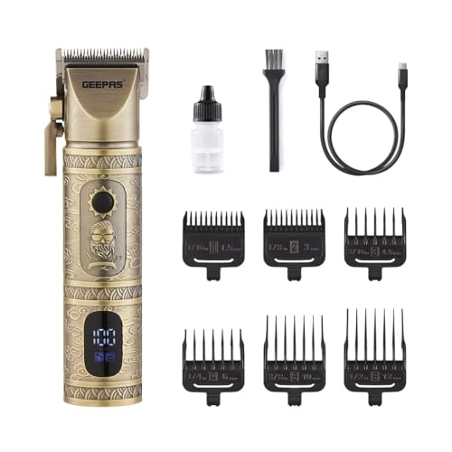 Geepas Professional Hair Clipper |Rechargeable Vintage Beard Trimmer| LED Display, Li-ion 2000mAh Battery | 6 Limit Comb, USB Charging, 200 Mins Working Time, Cord/Corded Operation, Gift for Men