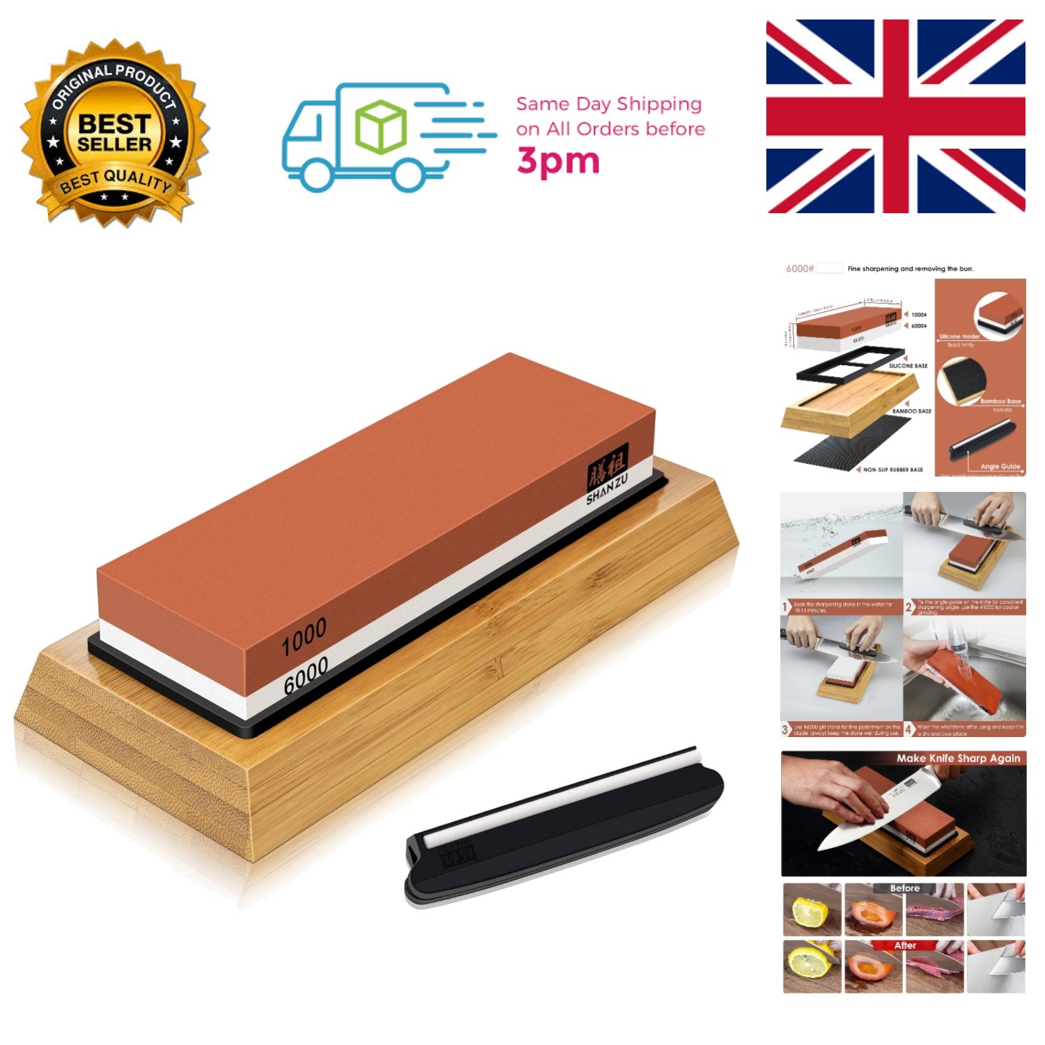 Professional Whetstone Knife Sharpener 1000/6000 with Bamboo Base & Angle Guide