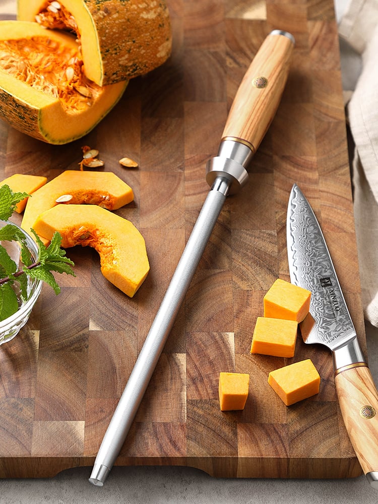 XINZUO Professional Chef Knife Sharpener Rod High Carbon Steel Diamond Sharpening Stick with Olive Wood + Copper Flower Handle