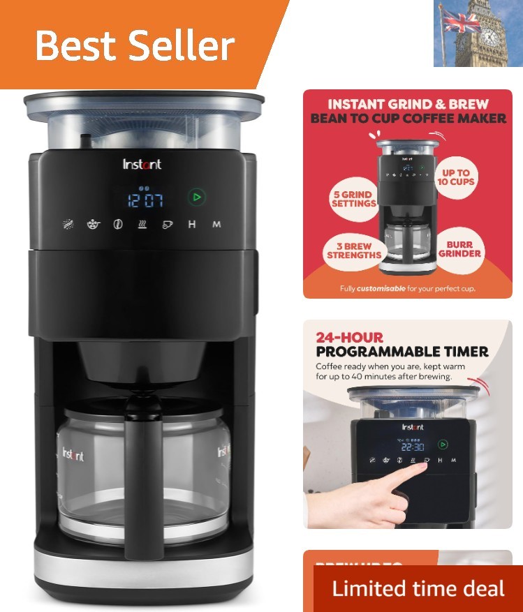 Instant Grind and Brew Bean to Cup Coffee Maker, 24 Hour Programmable Filter Coffee Machine, Reusable Filter, Glass Carafe, Digital Display - 4-10 cup