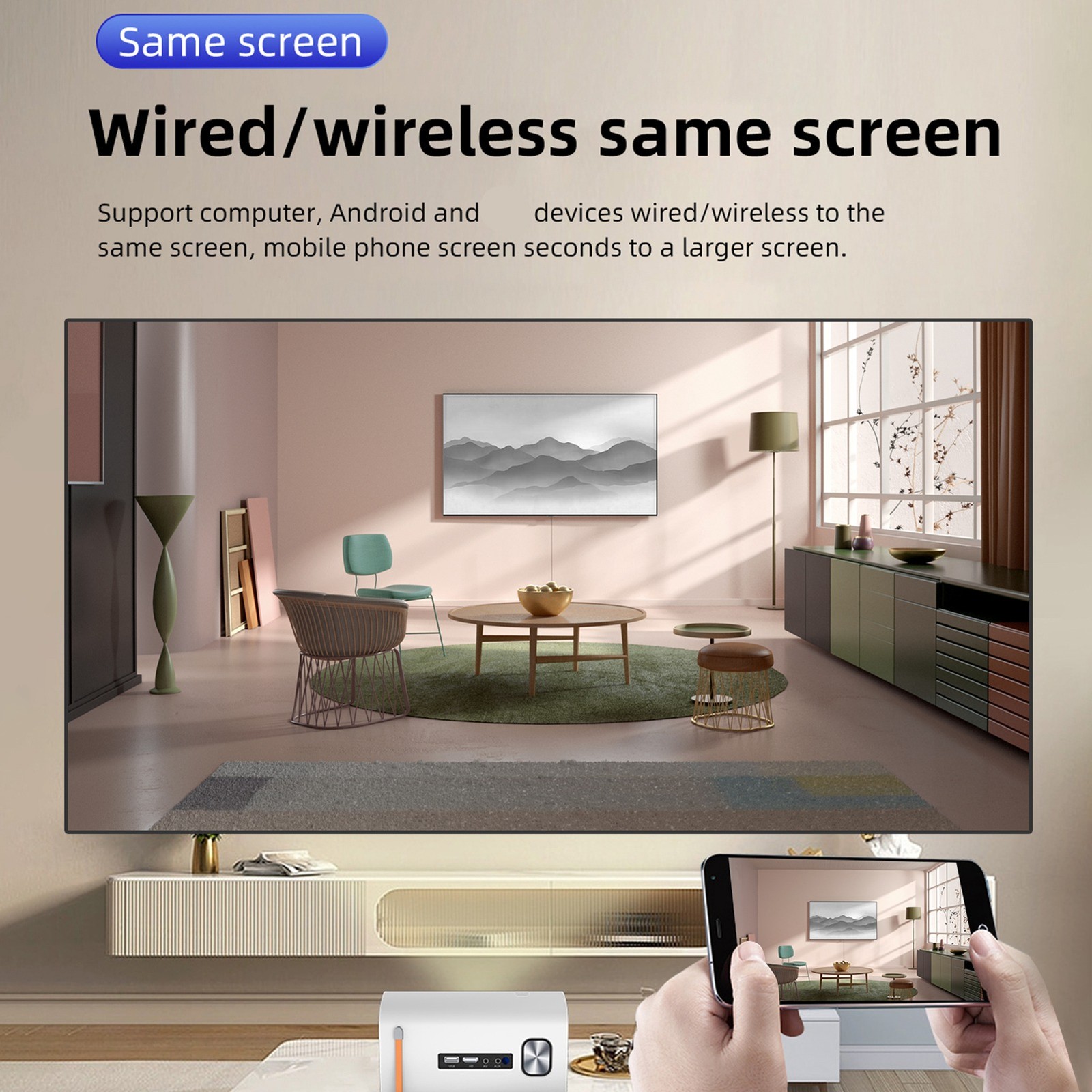 mophrati Full Electric Focus PTZ Projection Home Theater Projectors Portable Mini Projector Beam Projector Home Cinema Smartphone, Same screen for mobi