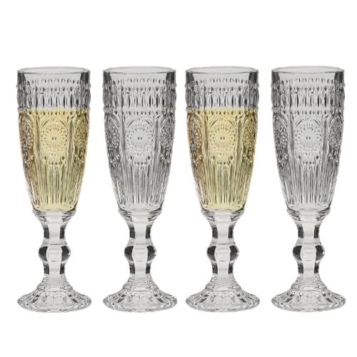 Set of 4 Champagne Flutes Embossed Short Stemmed Champagne Prosecco Glasses (DY46)