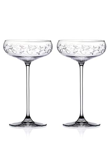 DIAMANTE Champagne, Cocktail or Prosecco Coupes/Saucers Glasses Pair with Arabesque Floral Etched Design in a Gift Box