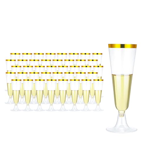 Yuedefly 50 pcs Plastic Champagne Flutes Set,5oz Cocktail Glasses with Golden Rim, Reusable Prosecco Glasses, Wine Cups for Parties, Wedding, Thanksgiving Day, Christmas,Birthdays, Picnic