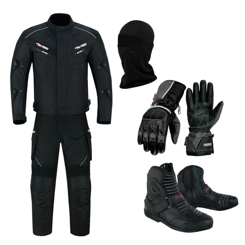 Full Set of Waterproof Motorbike 2 Piece Suit Motorcycle Protective Clothing in Cordura Fabric CE Approved Armours - Jacket + Trouser + Boots + Gloves + Balaclava (Black, L - 40 Chest / 34 Waist)