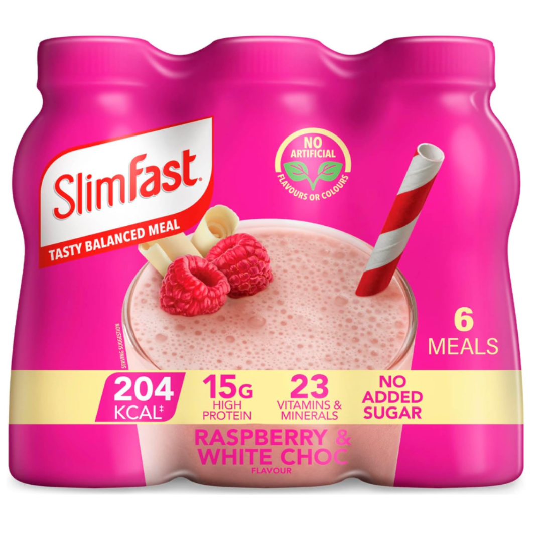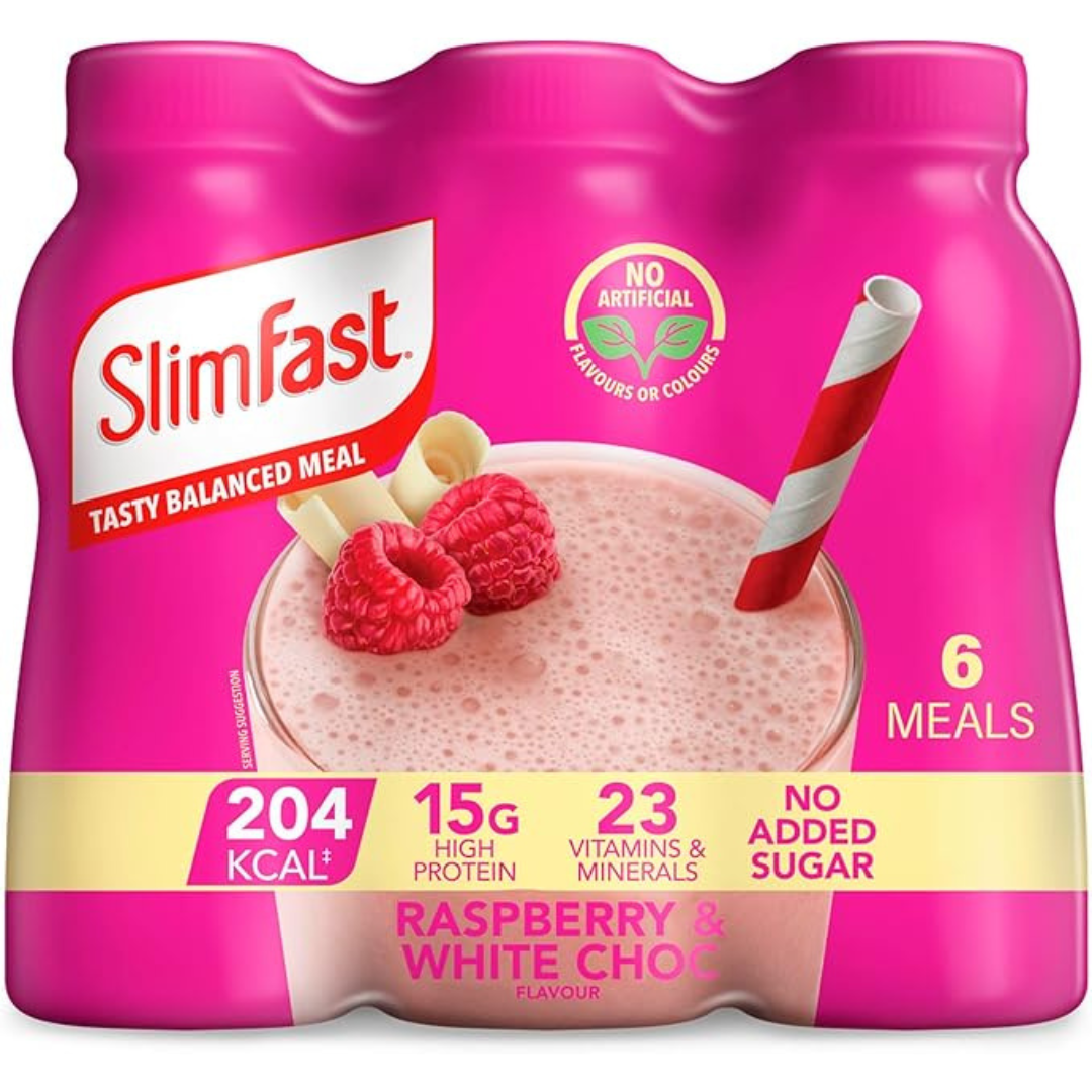 SlimFast Ready To Drink Shake, Meal Replacement Shakes for Weight Loss and Balanced Diet, High Protein, Vitamins and Minerals, No Added Sugar, Raspberry and White Chocolate Flavour, 6 x 325 ml