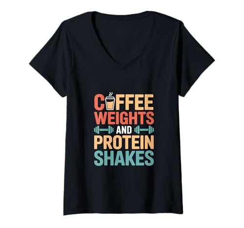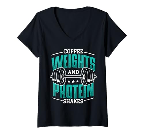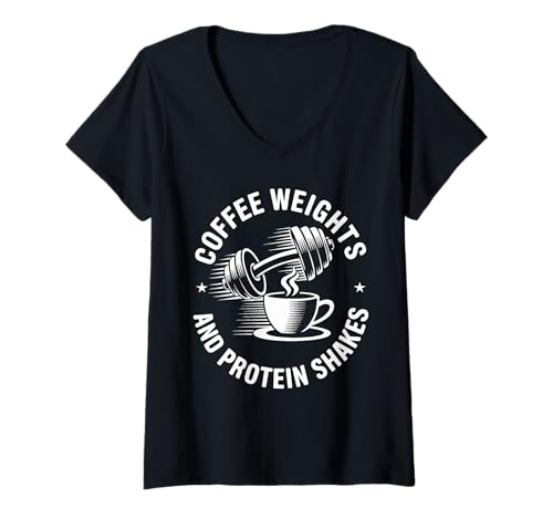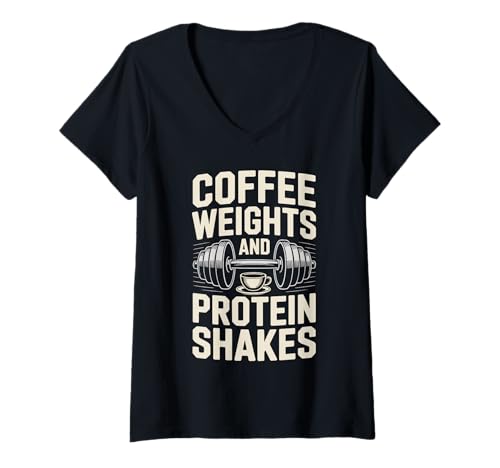 Women's Coffee Weights Protein Shakes Funny Saying V-Neck T-Shirt