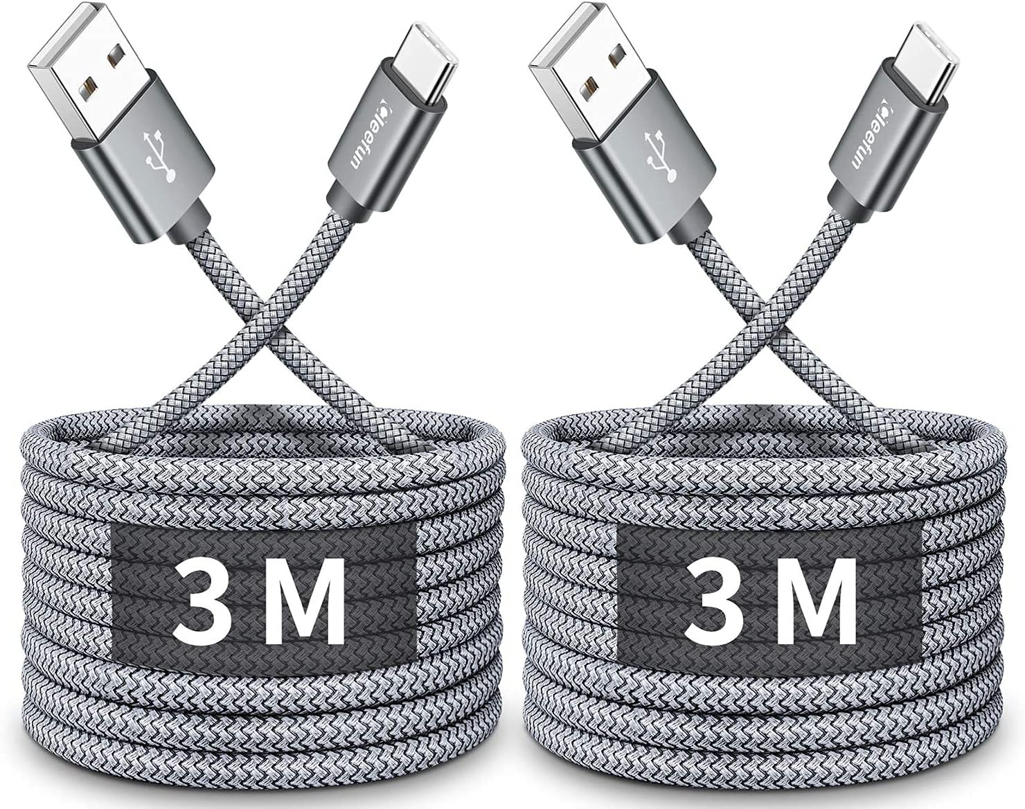 CLEEFUN 3M USB C Cable (2-Pack), Long PS5 Controller Charger Fast Charging USB-C to USB-A Braided Lead for iPhone 17 16 16e 15 Pro, Samsung S25 S24 S23 S22 S21 S20 S10 S9 S8 + A51 A52 A53 A70 -Grey