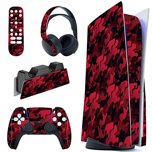 playvital Black Red Camouflage Full Set Skin Decal for ps5 Console Disc Edition, Sticker Vinyl Decal Cover for ps5 Controller & Charging Station & Headset & Media Remote