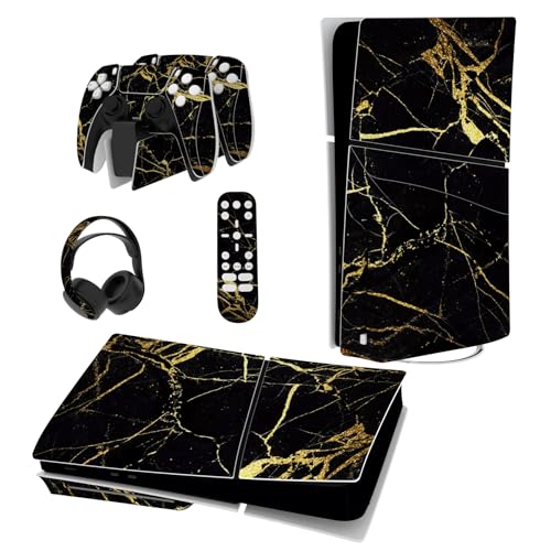 playvital Full Set Skin Sticker for ps5 Slim Console Disc Edition (The New Smaller Design), Vinyl Skin for ps5 Controller & Headset & Charging Station & Media Remote - Black & Gold Marble Effect