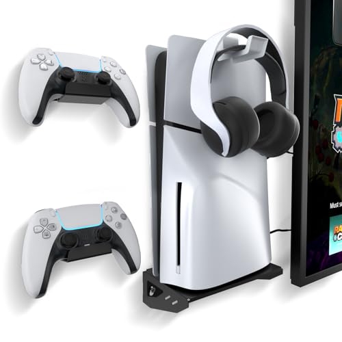 HEATFUN Wall Mount Kit for PS5 Slim 2023 (Disc and Digital Edition), Stand with 2 Controller Holders 1 Headphone Hook, Upgraded Floating Screw Fixing - Black