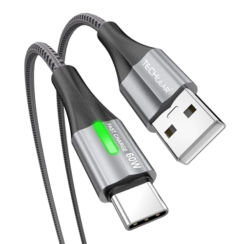 TECHGEAR 60W USB C Charger Cable, LED Light Indicator Type C Fast Charging Braided USB A to USB-C Phone Charger Cable for iPad A16 / Air/Pro, iPhone 17/16/15 Pro Max, S25 S24, Pixel, PS5, Switch etc