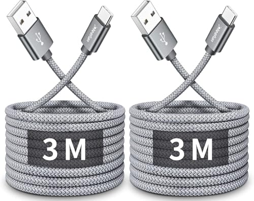 CLEEFUN 3M USB C Cable (2-Pack), Long PS5 Controller Charger Fast Charging USB-C to USB-A Braided Lead for iPhone 17 16 16e 15 Pro, Samsung S25 S24 S23 S22 S21 S20 S10 S9 S8 + A51 A52 A53 A70 -Grey