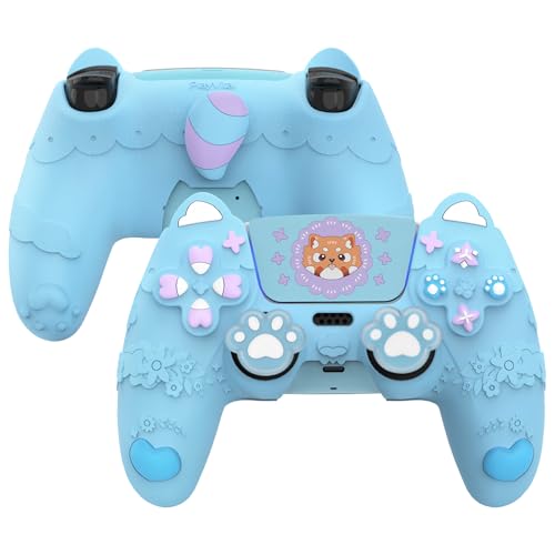 PlayVital Cute Spring Lesser Panda Silicone Cover for ps5 Controller with Joystick Cap and Sticker, Anti-Grip Shockproof Skin, Compatible with Charging Station, Heaven Blue