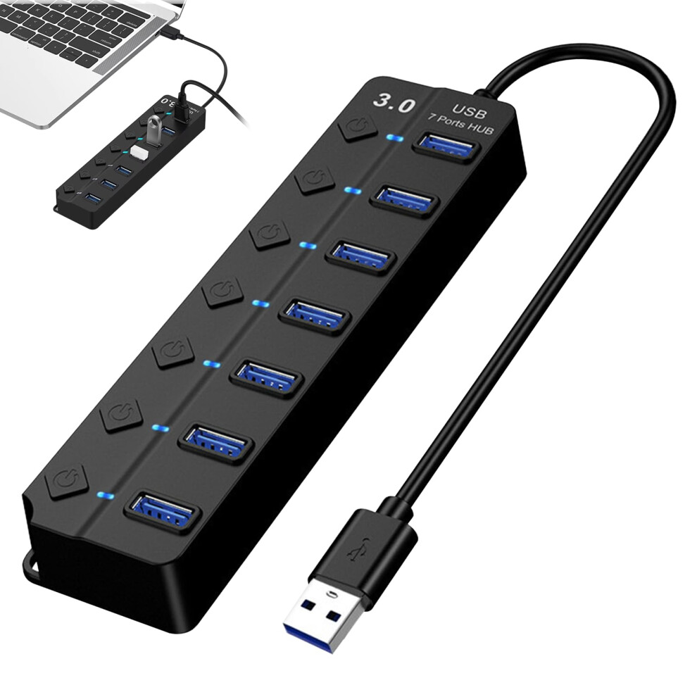 USB 3.0 Hub 7-Port With Individual Switches And LED Lights, Compatible With Laptop, PC, PS5, MacBook