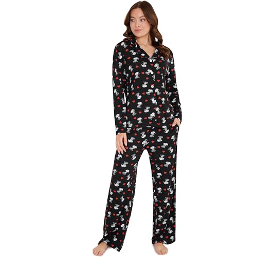 Peanuts Snoopy Pyjamas Women Long Sleeve PJs Set Classic Button Down Lounge Sets Nightwear Loungewear Sleepwear Gifts for Her (M, Black)