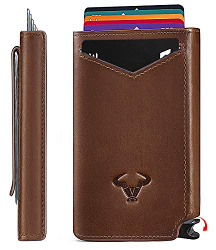 VULKIT Mens Wallet Credit Card Holder Pop up Card Case Top-Grain Cowhide Genuine Leather RFID Blocking Wallet with Banknote Compartment, ID Window and Magnetic Strip Closure