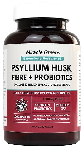 Powerful 4000mg Psyllium Husk Fibre with Probiotics – 20 Billion CFU with 10 Strains – Natural Easy to Absorb Fibre from Plantago Ovata Seeds - 120 Capsules to Promote Regularity & Digestive Health