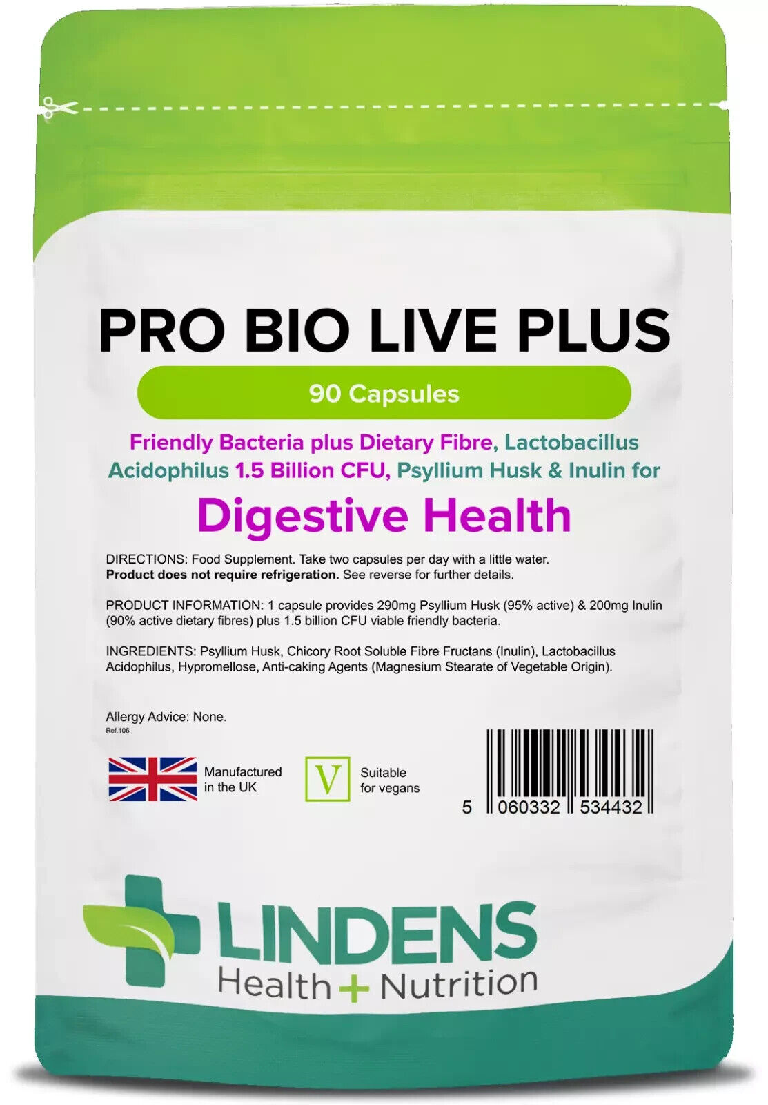Lindens Pro Bio Live Plus 90 Capsules Acidophilus Inulin Psyllium Fibre UK Made